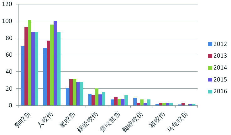 近年来随着宠物数量增加,咬伤伤害发病也在逐年增加,有报道[3]欧洲和美国每年发病率分别为1.75‰和7.4‰。除南极洲外几大洲均有狂犬病发病[4]。某些动物咬伤还可释放毒素入血,严重时导致机体多器官功能损害,如蛇咬伤、蜂蛰伤、蜈蚣、蜘蛛叮咬伤。本研究动物咬伤中狗咬伤(37.24%)为第一位,与文献[5-6]报道一致。近五年总数人咬伤仅比狗咬伤少10例位居第二。而德国每年有40 000咬伤事件发生,大部分为狗、猫,人咬伤很少[7]。人咬伤创口与狗咬伤相比组织撕裂不重,范围相对局限,但人唾液中有上千种细菌,咬伤后细菌急剧蔓延,会致创面感染,甚至造成骨髓炎截指等严重并发症。故伤后应尽早就诊,早期彻底清创,本组有56例延迟就诊患者创口感染。彻底清创同时,注意病毒监测,文献报道[8-9]通过人咬伤也可传播HIV,肝炎病毒。动物咬伤第三位是鼠咬伤,共139例,占11.8%,其中咬伤后发热8例,肾功能损害者5例。鼠咬伤中大部分患者来自农村山区,卫生条件较差。近两年仓鼠咬伤有5例,为逗玩或喂食笼养仓鼠时被咬伤。另有一例为实验大鼠咬伤,为抓鼠方法不当所致,应该警惕。