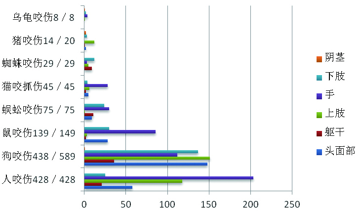 动物咬伤共1176例,1336处。其中狗、鼠、猪咬伤为多处,狗咬伤438例/589处;鼠咬伤139例/149处;猪咬伤14例/20处。咬伤部位中手部最多,共466处(占34.88%),其次是上肢22.23%和头面部18.31%,躯干最少6.14%,另有4例阴茎咬伤,见图 4,5。