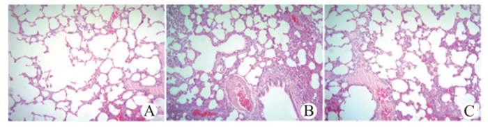 A:S组;B:CLP组;C:AMB组 图 1 各组光镜下肺组织HE染色(×100) Figure 1 Henntoxylin and eosin stain in lung tissue of rats (×100)