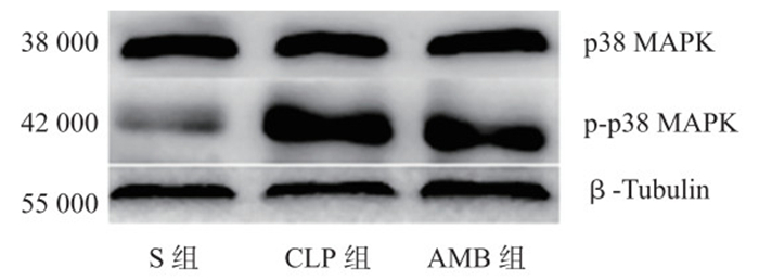 三组肺组织p38 MAPK表达水平差异均无显著性(P > 0.05);与S组比较,CLP组和AMB组大鼠肺组织p-p38 MAPK平均吸光度值均明显升高(P < 0.05);与CLP组比较,AMB组大鼠肺组织p-p38 MAPK平均吸光度值明显明显降低(P < 0.05)。CLP组和AMB组A p-p38 / A p38的比值明显高于S组,且以CLP组的比值最高(P < 0.05)。见表 4图 2
