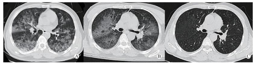 | 图 1 患者入院2 h(A)、第3天(B)及第5天(C)胸部CT变化 |