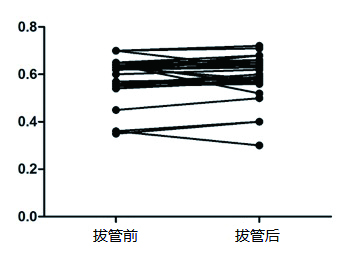 | 图 2 两组患者拔管前后氧合指数比较 Figure 2 Oxygenation index before and after extubation in both groups were compared |