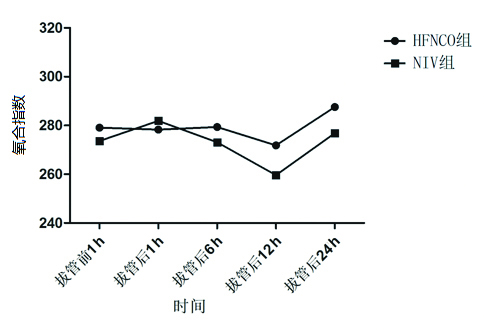 2.2.2 对两组患者呼吸循环指标进行比较两组患者治疗后1~24 h内,HFNCO在改善PaO2、降低PaCO2方面作用较NPV组效果效果略高,但差异无统计学意义(P>0.05);两组患者动脉血pH、乳酸等差异无统计学意义(P>0.05)。HFNCO在改善氧合指数方面作用较NPV组效果更好(P<0. 05),其中HFNCO组拔管后24 h氧合指数改善最为明显,NIV组于拔管后1 h氧合指数改善最为明显(图 2); 两组患者拔管前HR、RR均处于偏高或正常偏高水平,HFNCO组较NPV组降低HR、RR效果更为显著。时间因素在降低心率方面差异具有统计学意义(P<0.01),HFNCO组患者心率随着时间的进展呈平稳下降趋势,NIV组患者心率在拔管后1 h出现小幅度上升后逐渐降低(P<0.05)(图 3);HFNCO组在降低呼吸频率方面作用较无创更显著(均P<0.01),时间因素在降低呼吸频率方面也有统计学意义(P<0.01),患者呼吸频率随着时间的进展呈平稳下降趋势,其中经鼻组患者在拔管后24 h,呼吸频率降低最为显著(图 4)(表 1)。