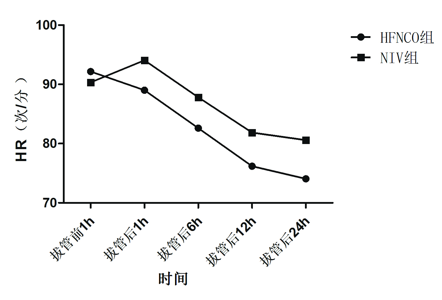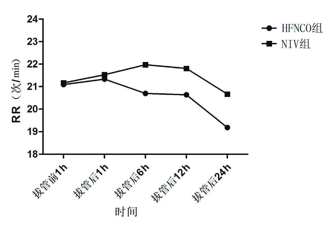 本研究中HFNCO较NIV能更好地提高患者氧合指数,与研究基本相符[2, 10-11, 19];随着时间推移,HFNCO对患者氧合指数的改善较无创组更好。患者拔管前HR、RR均处于偏高或正常偏高水平,在HFNCO组较NPV组降低HR、RR取得更加明显的效果。分析原因可能为:HFNCO组患者有更高氧合指数,机体需要的心率与呼吸频率均能有所下降;面罩吸氧会于面部形成封闭空间,正压通气会为患者带来不适感,如鼻面部压痛、鼻腔干燥等[17],并在一定程度上影响患者进食、饮水、活动等,极易使患者产生恐惧、焦虑情绪[18-19];HFNCO无面罩封闭与挤压,佩戴更加舒适,方便患者与人交谈以及早期床旁活动,在很大程度上缓解患者焦虑,使患者心情缓和,在一定程度上降低患者的应激反应,HR、RR可随之降低。