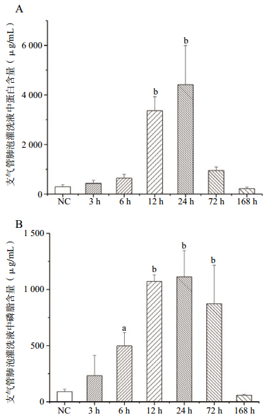 1.3.2 肺组织匀浆和BALF的制备及蛋白和磷脂含量测定如上所述,在取出右肺后,经左支气管插管,参照文献[11]所述方法制备支气管肺泡灌洗液(BALF)。右肺(副叶除外)用于制备10%肺组织匀浆。Lowry法测BALF中总蛋白含量,采用Wako公司磷脂试剂盒测定磷脂含量。