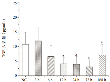 在PFIB暴露后,肺组织匀浆中TGF-β含量进行性降低,至暴露后72 h到谷,其后缓慢升高(图 5)。这一变化与前述肺损伤(肺质量、肺系数、BALF中蛋白质和磷脂含量)严重程度的变化在时间上基本吻合。