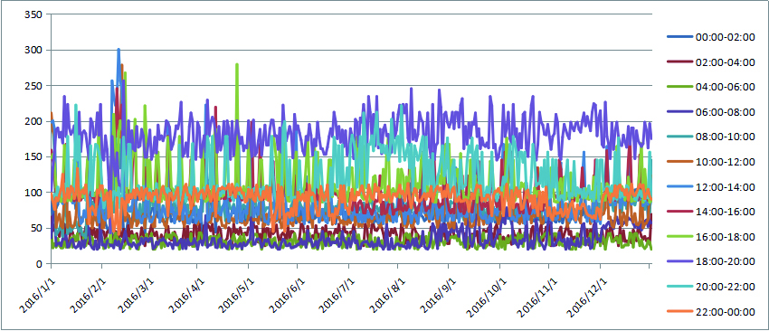 图 2 2016年上海某三甲医院急诊科就诊人次数各时间段分布 Figure 2 The distribution of patients in different periods in a Shanghai 3rd Grade Class A hospital in 2016