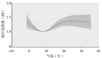 在就诊人数与气象因素关系的分析过程中,采用广义相加模型调整了时间的长期波动、季节趋势、星期几和节假日效应、大气污染物等因素后发现,气温对急诊就诊人次的暴露反应关系呈“J”型分布,与先前报道的特定疾病和气温的关系结果相似。经进一步定量分析发现,7℃左右为最适温度,急诊就诊人次数最少,就诊风险最低。日均气温、最高温度、最低温度对急诊日就诊人数有正向相关影响,气温每上升1℃。经过对数转换观察气温变化对急诊就诊量的影响,发现在0~7 d的滞后效应下,适宜温度以下温度每下降1℃,急诊就诊量增长2.43%(95%CI: 0.83%~4.18%),适宜温度以上每上升1℃,急诊内科就诊量增长0.96%(95%CI: 0.31%~1.64%)。郭亮等分析上海市某中心城区医院急诊内科就诊量与气象要素变化关系发现气温对于该院急诊内科就诊量变化的暴露反应关系呈J型分布,低温和高温就诊量均增加,低温效应可长达2周以上与本研究结果相似。