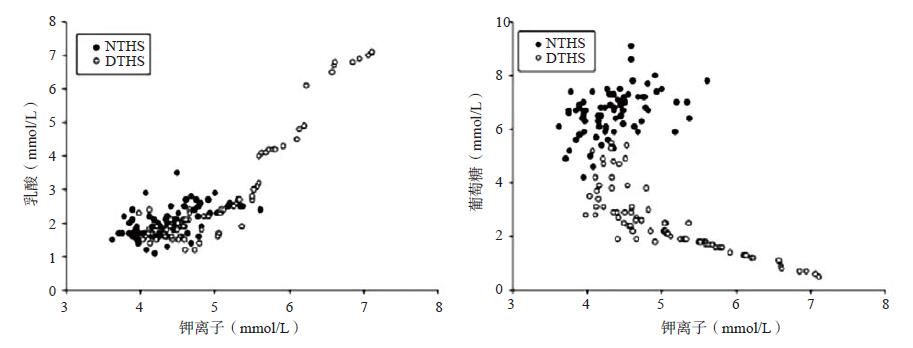 血清乳酸浓度暴露后血清乳酸(Lac)浓度各组间差异无统计学意义,休克后自0 h开始,NTHS组和DTHS组均呈上升趋势。NTHS组自创伤失血性休克后缓慢上升,自4 h后呈快速上升,0.5 h后即与NS组差异有统计学意义(t=2.5,P < 0.05)。DTHS组休克后即呈进行性快速上升趋势,2 h后尤显突出,与具有上升趋势的NTHS组和DS组和自创伤失血性休克1.5 h后,差异有统计学意义(t=6.30,P < 0.01)。休克3 h DTHS组血清Lac浓度达(6.74±0.32) mmol/L,而NTHS组和DS组分别是(2.57±0.35)mmol/L、(1.68±0.13) mmol/L(图 3)。至DTHS组动物死亡,血清K+与Lac浓度呈正相关,相关系数分别为rDHTS=0.927,rNTHS=0.539(P < 0.01),见图 4