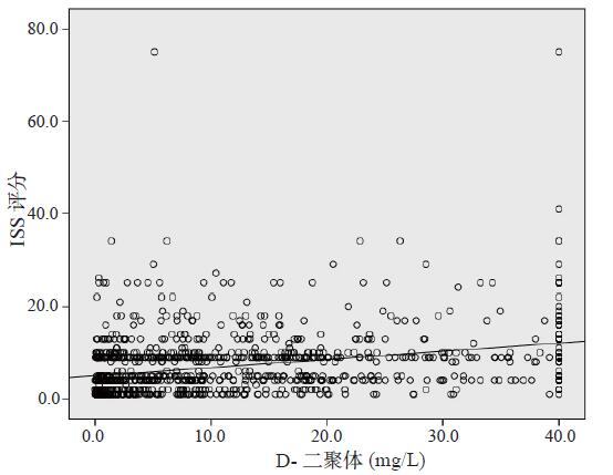 | 图 1 D-二聚体与ISS评分值的相关散点图 Figure 1 Scatter plot of D-dimer versus ISS |