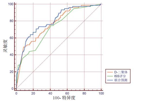 ISS评分、D-二聚体以及ISS评分联合D-二聚体对患者病死率预测性能进行比较,生成ROC曲线,并对曲线下面积进行比较(图 2)。