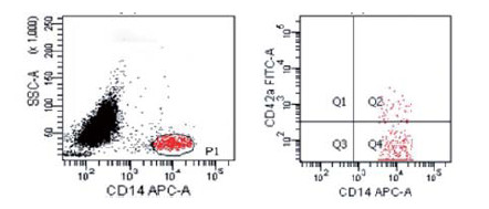 1.2.3 检测方法入选者均在诊断当日用EDTA-K2试管采集肘静脉血4 mL, 为防止血小板活化影响测定结果, 弃掉开始2 mL血, 不能使用压脉带采血, 采集好的标本立即送入中心实验室, 并在4 h内完成流式测定。取流式检测管分别加入CD14-APC 10 μL、CD42a-FITC 10 μL单克隆抗体。取100 μL全血用移液枪移入流式管中, 混匀后室内温度下阴暗处孵育20 min。加入PBS缓冲液洗涤, 固定10 min。加入溶血剂溶解红细胞15 min。溶血后1 500 r/min离心5 min。弃去上清液放入PBS缓冲液, 轻轻的振荡悬浮细胞。以IgG2b-APC和IgG1-FITC作为阴性同型对照。测定前应用Flow-check液进行光路标定, 使用CD42a/CD14设门, 在CD14/SSC直方图中, 圈出CD14阳性的群体为单核细胞(P1), 每个样本分析10 000个细胞, 以CD 14和CD 42a双阳性颗粒代表PMA(Q2), 见图 1。IL-6检测由中心实验室专职人员完成检测。