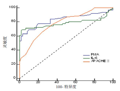 | 图 2 PMA、IL-6、APACHE Ⅱ预测ARDS发生的ROC曲线 Figure 2 ROC curves of PMA, IL-6 and APACHE Ⅱ to predict the occurrence of ARDS |