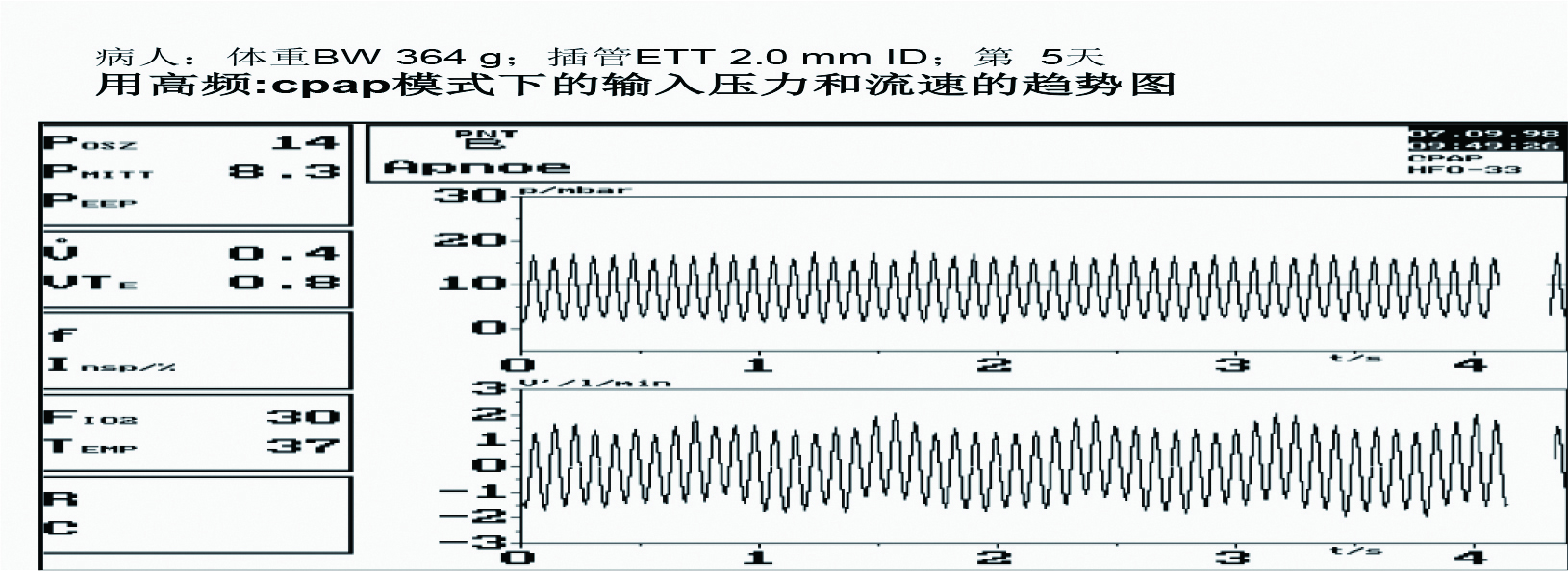 高频的CPAP模式既可用于插管通气患儿的撤机过渡,也可用于鼻塞式无创通气。其组合的特点是患儿可在设置的呼气末正压(positive end-expiratory pressure, PEEP)水平上叠加机器提供的高频率辅助气流进行自主呼吸,高频率气流能加速推动患儿吸入氧气,特别是负向的高频率气流能主动将CO2排出肺泡,有利于获得较理想的肺容量和维持较好的PEEP,有利于分泌物的松动和CO2的排除,减少患儿的呼吸做功和减少人机对抗。
