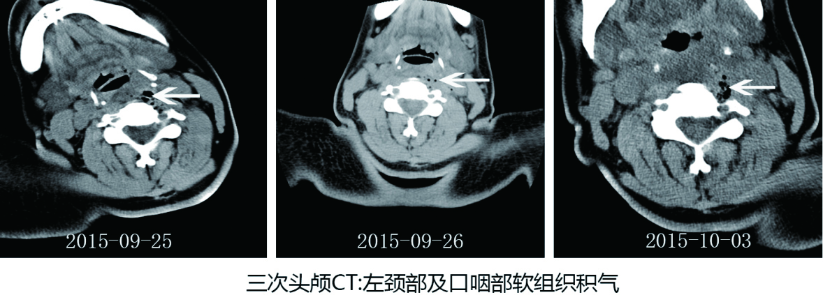 患者,女,56岁。因“呕血、黑便2 d”于2015-10-04拟“上消化道出血”入院。患者于9月25日被竹竿刺伤舌部,舌体部分断裂,喉镜咽部检查未见明显异常,CT示:左颈部及口咽部软组织损伤、积气,拟诊“舌外伤”,予舌部清创缝合术后,转本院就诊,复查CT示:咽喉壁后缘及左侧胸廓入口处软组织间隙散在积气,在急诊病房留观,拟诊“舌外伤”予抗炎、止血等治疗,4 d后,病情好转出院。既往有高血压病史。患者于2 d前无明显诱因突发呕鲜红血,大约150 mL,次日又少量呕血两次,解柏油样大便一次,再来本院就诊,查血常规:红细胞2.18× 1012/L-1,血红蛋白61 g/L,腹部CT未见异常。鉴于患者曾有舌部外伤病史,故请耳鼻喉科、口腔科及消化科共同会诊,入院诊断:上消化道出血,收住本院消化内科诊治。入院查体:体温36.6℃,脉搏86次/min,呼吸16次/min,血压98/67 mmHg(1 mmHg=0.133 kPa)。神清,贫血貌,舌部清创缝合术后,腹平软,轻压痛,其余无特殊阳性体征。入院后予以输血、抑酸、护胃、止血、扩容等对症支持治疗。患者于10月05日凌晨突发呕出大量鲜红色血液,随后心搏呼吸停止,予心肺复苏,0.5 h后抢救无效,宣布患者死亡。患者头颅CT及尸检结果见图 1, 2