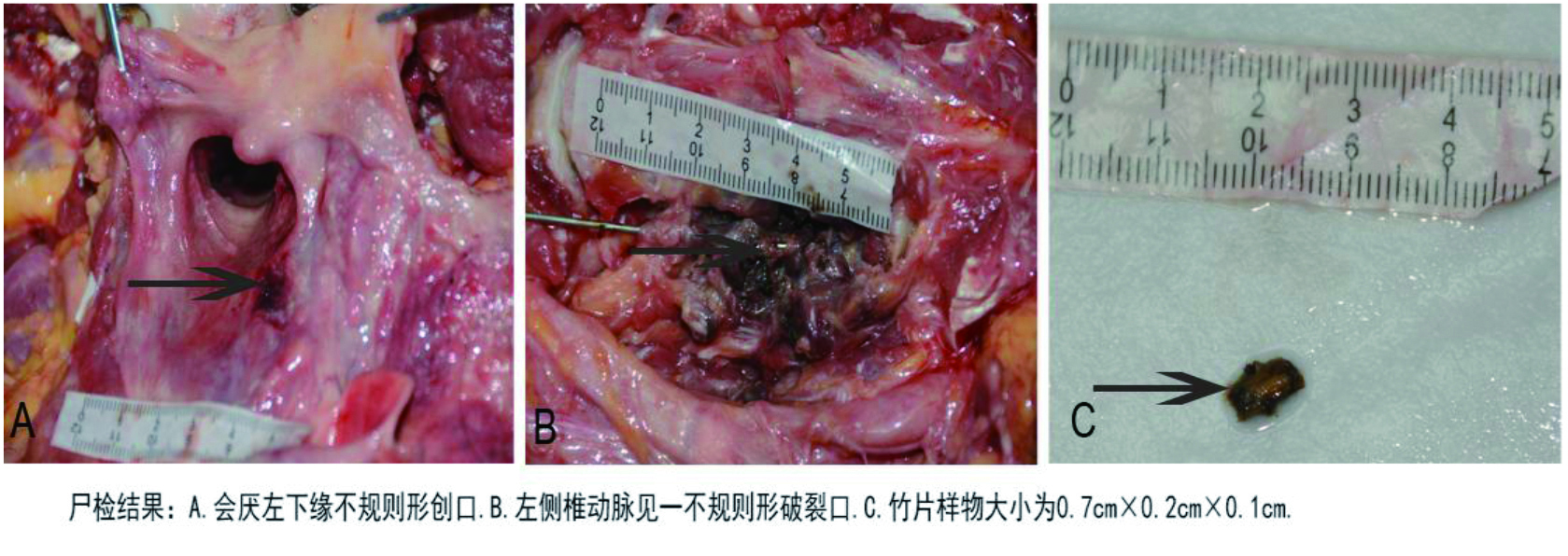 尸检结果:胃内见500 mL血性液体,胃肠黏膜未见异常。会厌左下缘1.5 cm×1.0 cm不规则形创口,深2.5 cm,深达椎体。左颈部深部肌层见6.0 cm×3.0 cm出血,左侧椎动脉见一不规则形破裂口,内有竹片样物,竹片样物大小为0.7 cm×0.2 cm×0.1 cm。