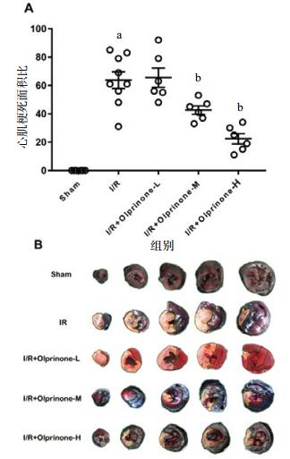 如图 1所示,与I/R组比较(63.66±5.89)%,I/R+Olprinone-M组、I/R+Olprinone-H组的心肌梗死面积百分比分别为(42.66±2.94)%、(22.33.44±3.63)%,差异有统计学意义(t=3.13, P < 0.01:t=6.16, P < 0.01), I/R+Olprinone-L组(65.50±6.83)%,差异无统计学意义(t=0.27, P > 0.05)。