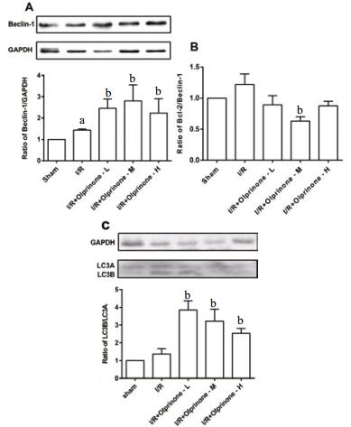 2.5 对大鼠缺血-再灌注中Beclin-1蛋白、Bcl-2/Beclin-1比值,LC3B/LC3A比值的影响与sham组Beclin-1蛋白水平比较,I/R组Beclin-1蛋白表达量升高(1.43±0.06, t=2.46, P < 0.05);olprinone-L组、olprinone-M组Beclin-1的表达均高于I/R组(2.46±0.44,t=2.50, P < 0.05;2.80±0.75,t=2.194, P < 0.05), 差异有统计学意义,olprinone-H组表达量为(2.23±0.68,t=1.263,P > 0.05),差异无统计学意义。由Bcl-2与Beclin-1蛋白表达计算得出Bcl-2/ Beclin-1比值,与sham组相比,I/R组Bcl-2/Beclin-1比值未有降低(1.22±0.44,t=1.37,P > 0.05);olprinone-L组、olprinone-M组、olprinone-H组预处理使其不同程度降低,但只有olprinone-M组差异有统计学意义(0.89±0.69,t=1.46,P > 0.05;0.63±0.13,t=2.50,P < 0.05;0.87±0.20,t=1.86,P > 0.05)。相比Sham组,I/R组升高LC3B/LC3A比值(1.36±0.31,t=1.59,P > 0.05),olprinone-L组、olprinone-M组、olprinone-H组LC3B/LC3A比值分别为(3.84±0.52,t=3.92,P < 0.01;3.22±0.67,t=2.50,P < 0.05;2.53±0.58,t=2.36,P < 0.05),差异有统计学意义,但olprinone-M组LC3B/LC3A比值居中。