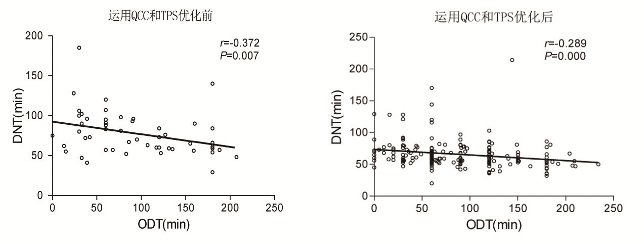 本研究表明采用QCC和TPS方法能有效优化静脉溶栓流程,显著缩短DNT时间,以发病为120 min以内DNT缩短最为显著,还能增加DNT≤60 min的比例从29.8%提高到59.6%,提高发病4.5 h内的静脉溶栓率从6.4%提高到9.3%。同时,采用QCC及TPS有效减弱ODT与DNT之间的负相关性。采用QCC和TPS方法还提高了静脉溶栓率。本院流程优化后的静脉溶栓率为9.3%,比未优化前的溶栓率高2.9%。但仍低于于欧盟SITS-MOST研究得出的静脉溶栓率12.3%[7],这可能与国内患者及家属对溶栓治疗不理解有关[11]。