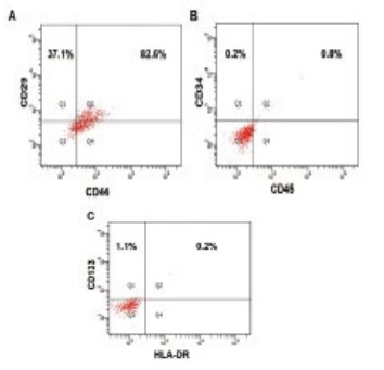 选取生长状态良好的第3代细胞进行鉴定。采用直接法分别加入20 μL的抗人CD45-PerCP、HLA-ABC-FITC、HLA-DR-FIT,CD29-PE、CD34-PE、CD44-FITC、于对照管中分别加入等量的抗人PE-IgG2a和PerCP-IgG1,FITC-IgG1,避光下温育20 min,PBS洗3次,1 500 r/min离心5 min,重悬制成单细胞悬液进行流式细胞仪检测。
