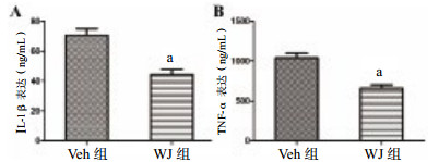 | 与Veh组比较,aP < 0.05 图 2 各组IL-1β和TNF-α的表达情 Figure 2 Expression of IL-1β and TNF-α in each group |