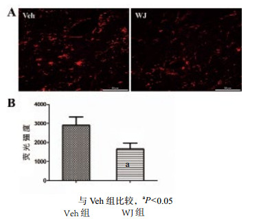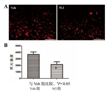 TBI后3 d,HEt染色检测小鼠损伤部位ROS的积累,统计分析荧光强度,WJ移植组(2 151±406.287)明显低于Veh组(3 687±380.466),WJ移植后能有效减少小鼠TBI后损伤部位ROS的积累(n=6,t=2.760,P=0.020),见图 3。