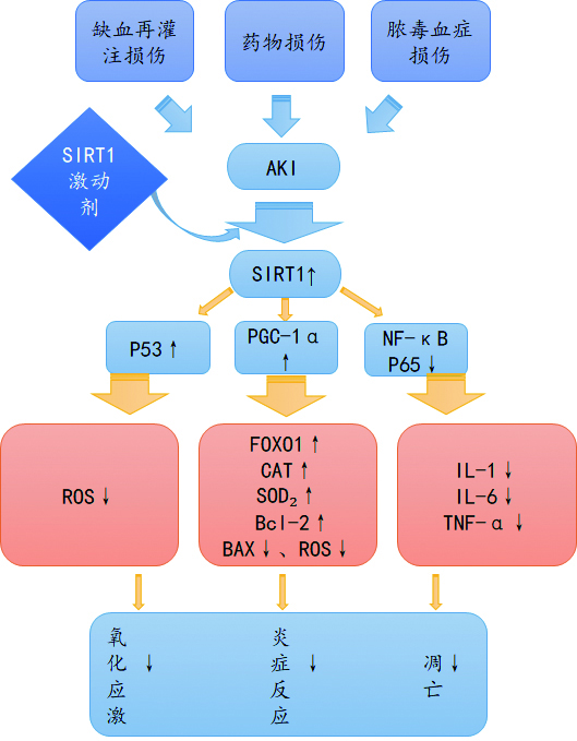 图 1 SIRT1对不同诱因诱导的AKI的保护机制