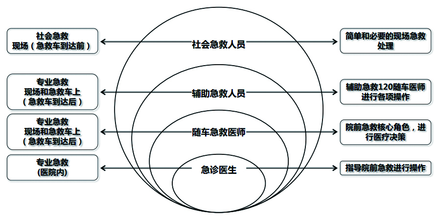 通过文献回顾、学者访学深入了解美国芝加哥和密尔沃基两市、芬兰、中国香港地区的院前急救体系后发现, 较为成熟和有效的院前急救往往有赖于发达的急救医疗链, 即大部分普通民众具备基本的急救知识, 专职院前急救和院内急救衔接良好。以美国为例,社会人员的急救知识普及极高,警察、司机、消防队员、大中学校师生都必须接受基础急救培训[4-6]。这样一个良好完整的急救链,按急救职能从低到高一般分为七层[7-9]:(1)普通社会人员基础生命支持,basic life support(BLS);(2)特殊社会人员第一目击者现场急救,first aid;(3)初级急救应答人员,emergency medical responder(EMR);(4)专职院前急救人员(初级),emergency medical technician-basic(EMT-B);(5)专职院前急救人员(高级),advanced emergency medical technician(AEMT);(6)院前急救士,paramedic;(7)院内急诊医师,emergency doctor。