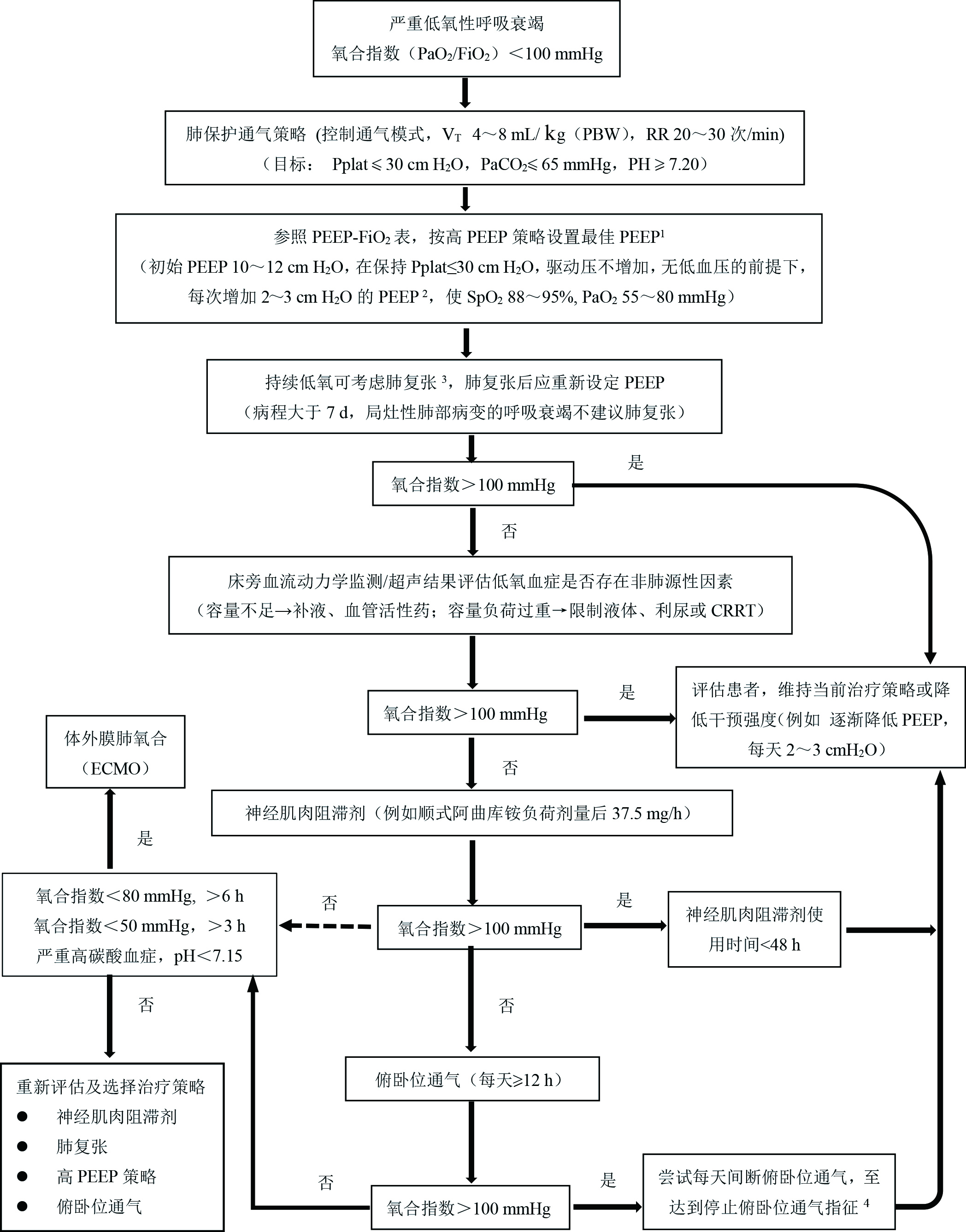 推荐意见7:顽固性低氧血症(PaO2/FiO2 < 80 mmHg大于6 h或 < 50 mmHg大于3 h或pH < 7.15的高碳酸血症),应考虑进行ECMO;对于未达到ECMO指征的患者,应重新评估及选择治疗策略,包括应用NMBA、RM、高PEEP策略和PPV等。