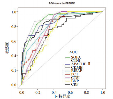 | 图 2 血CRP和PCT、CTSI评分、BISAP评分、APACHEⅡ评分、SOFA评分、proBNP、CK-MB和cTnI对SAP的预测效应汇总 Figure 2 The predictive ability of various indicators and score systems for SAP |