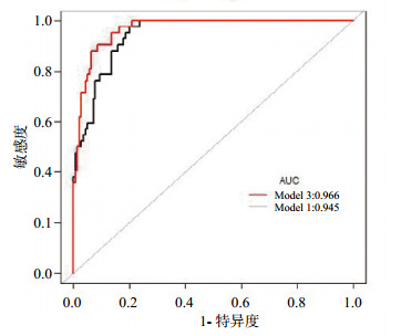 | 模型1为传统指标的ROC曲线(AUC=0.945),模型3为传统指标加上CK-MB、cTnI的ROC曲线(AUC=0.966)。Model 1 vs. Model 3, P=0.04 图 3 模型1与模型3对SAP的预测效应 Figure 3 The predictive effect of model 1 and model 3 on SAP |