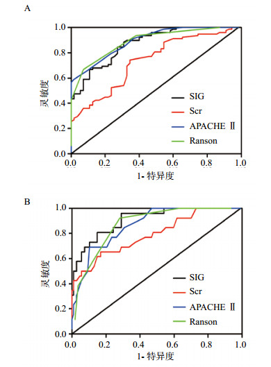 A:预测MSAP+SAP时的ROC曲线;B:预测SAP时的ROC曲线 图 1 SIG、Scr、APACHEⅡ评分及Ranson评分预测AP严重程度的ROC曲线 Figure 1 ROC curves of SIG, Scr, APACHEⅡ score and Ranson score for predicting the severity of acute pancreatitis