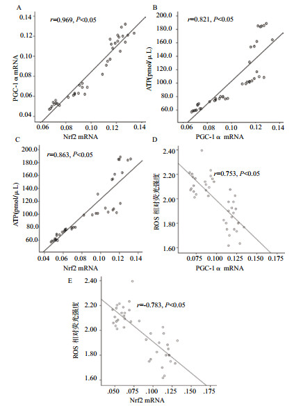 | A: PGC-1α与Nrf2 mRNA;B: ATP与PGC-1α;C: ATP与Nrf2 mRNA;D: ROS与PGC-1α;E: ROS与Nrf2 mRNA 图 1 ATP水平、ROS水平与PGC-1α和Nrf2 mRNA水平的相关性分析 |