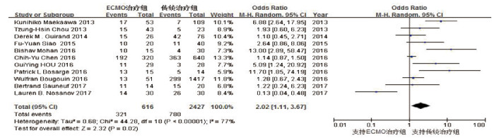 11项研究报道了院内存活率,各研究间异质性明显(P < 0.01, I2=77%), 利用随机效应模型进行Meta分析,结果显示,与传统治疗组相比,ECMO能够提高非肺部原发性急诊危重症患者的院内存活率[52.1%(321/616)vs.32.1%(780/2 427),OR=2.02,95%CI:1.11~3.67, P=0.02]。