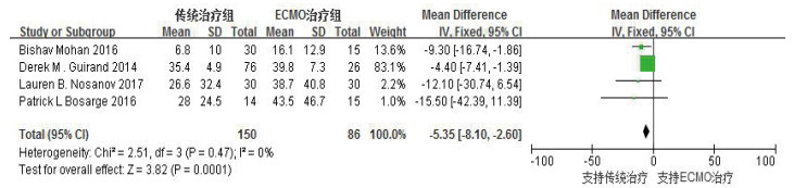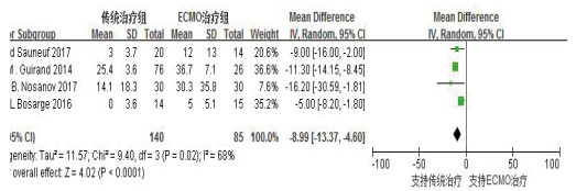 纳入的含有平均住院时间的研究有4项[2, 7, 10, 12],各研究间同质性较好(P=0.47, I2=0%),利用固定效应模型进行Meta分析,结果显示,ECMO在非肺部原发性急诊危重症患者中的应用可延长平均住院时间[加权均数差(MD)=-5.35,95%CI:-8.10~-2.60,P < 0.01];纳入的含有平均住院ICU时间的研究也有4项[2, 7, 10, 13],各研究间同质性欠佳(P=0.02, I2=68%),利用随机效应模型进行Meta分析,结果显示,ECMO在非肺部原发性急诊危重症患者中的应用可延长平均住ICU时间(MD=-8.99,95%CI: -8.20~-1.80,P < 0.01)。