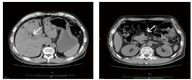 入院后在中心静脉压、有创动脉血压、每小时尿量、血气分析等严密监测下扩容补液、纠正酸中毒、亚胺培南西司他丁钠针联合利奈唑胺针抗感染、持续性血液净化纠正内环境等综合治疗后,病情逐渐好转,尿量增加,酸中毒纠正,肾功能恢复,血钠、血酮体降至正常,血糖控制在10 mmol/L以下。入院后第2天发现患者右上肢肢端温度低,右拇指发黑,血管超声示右上肢肱动脉远心端管腔闭塞,食道超声提示主动脉瓣近无冠瓣基底部可见4 mm×4 mm中等回声。入院第3天复查CT示肠系膜上静脉及门静脉积气消失(图 2)。入院第4天血培养回报:左侧外周为产气肠杆菌,右侧外周为草绿色链球菌,根据药敏结果调整抗菌药物为头孢曲松针联合左氧氟沙星针治疗,患者病情逐渐好转后出院。