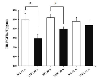 与NG组比较,SMG组HaCaT细胞经32 h和36 h后hb-EGF浓度明显下降(P < 0.01)。两组细胞在42 h培养后hb-EGF浓度差异无统计学意义(P > 0.05)。见图 2