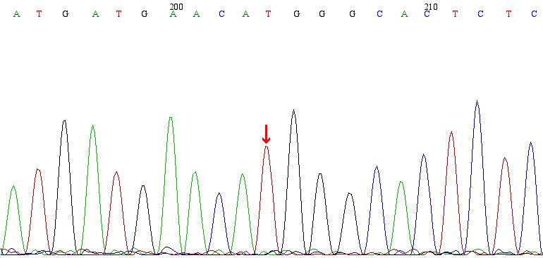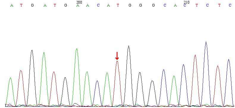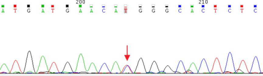 图 3 患者母亲SLC22A12基因携带一个c.650C>T(p.Thr217Met)杂合突变