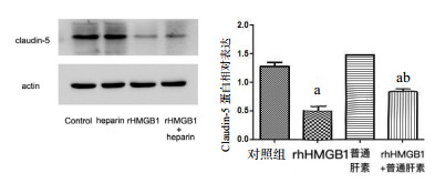 如图 3所示,经rhHMGB1处理后,Claudin-5蛋白表达较肝素组及PBS对照组减少。经普通肝素处理后,Claudin-5表达较rhHMGB1处理组有所增加。