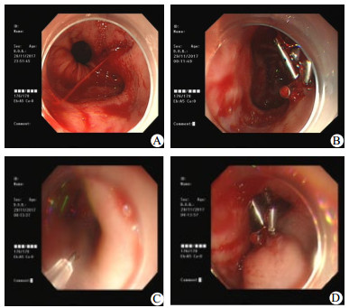 A:急诊胃镜发现贲门黏膜撕裂合并活动性出血点;B:钛夹夹闭出血点成功止血;C:出血点下方黏膜下注射硬化剂聚桂醇; D:黏膜下注射聚桂醇后巩固止血效果 图 1 患者急诊胃镜结果
