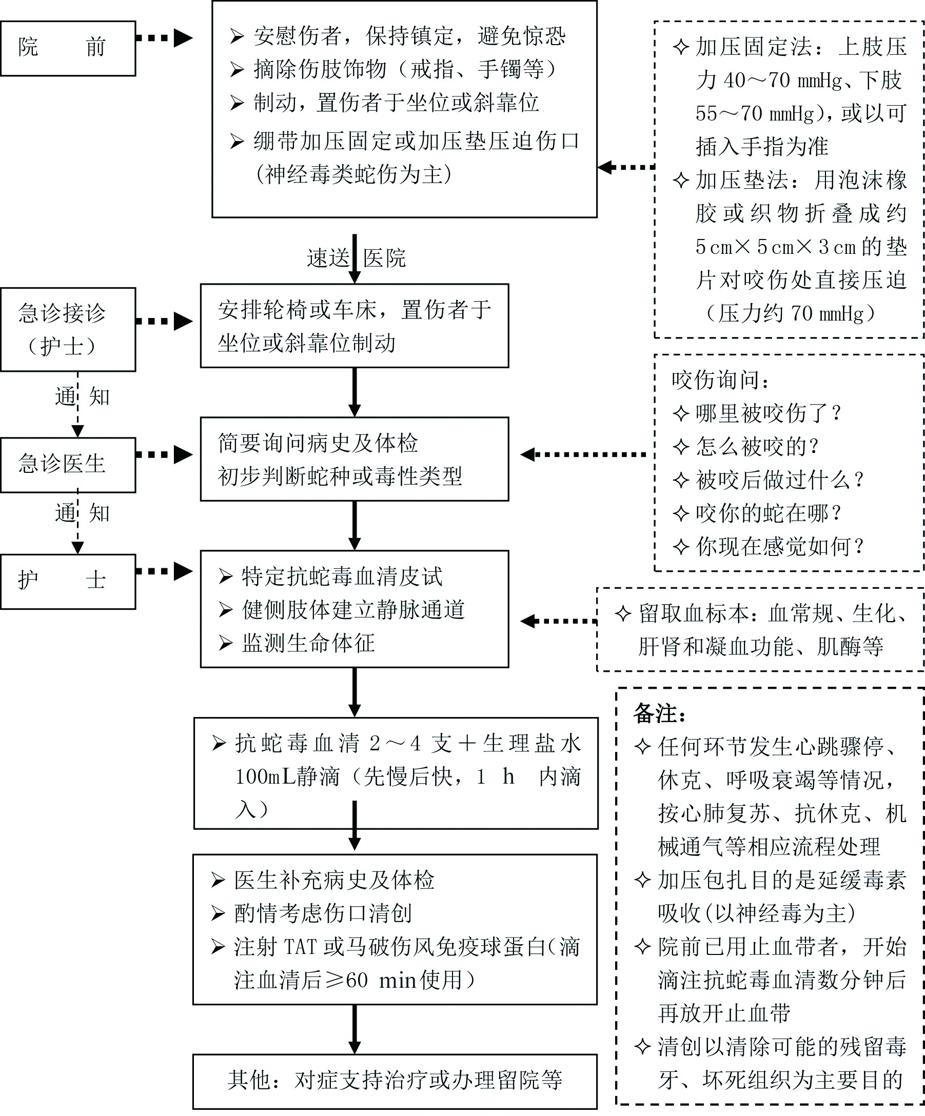 7.2 现场急救原则是迅速减缓毒液吸收,尽快送医院。有条件时可试用负压吸出局部蛇毒,考虑使用可破坏局部蛇毒的药物如胰蛋白酶、依地酸二钠(仅用于血液毒)进行伤口内注射,或1/1 000高锰酸钾溶液伤口内冲洗。总之,要尽量做无伤害性处理,不做无效的耗时性措施。不要等待症状发作以确定是否中毒,而应该立即送医院急诊处理[25]。蛇伤急诊流程[26](图 1)和主要急救措施[12, 25]: