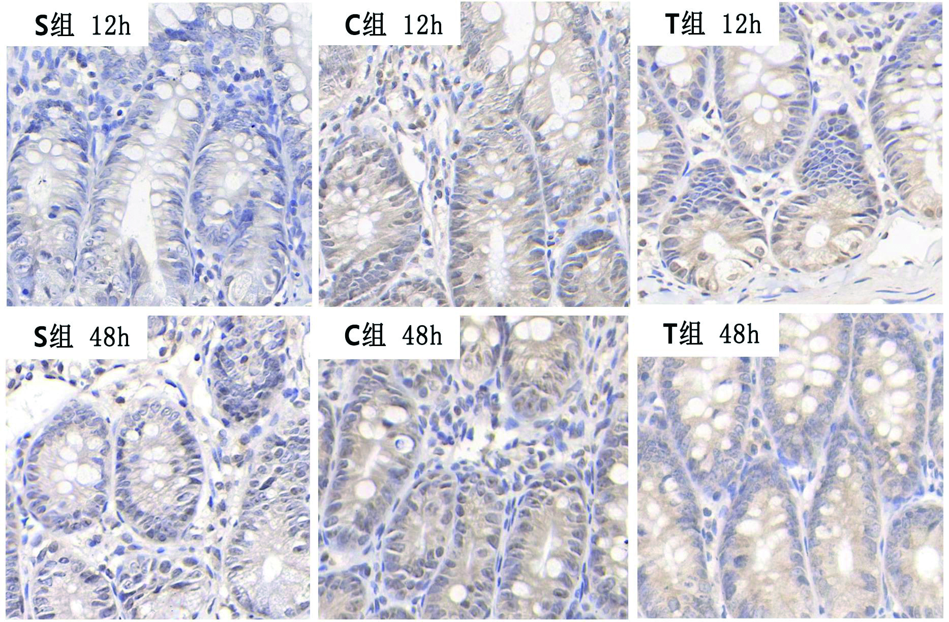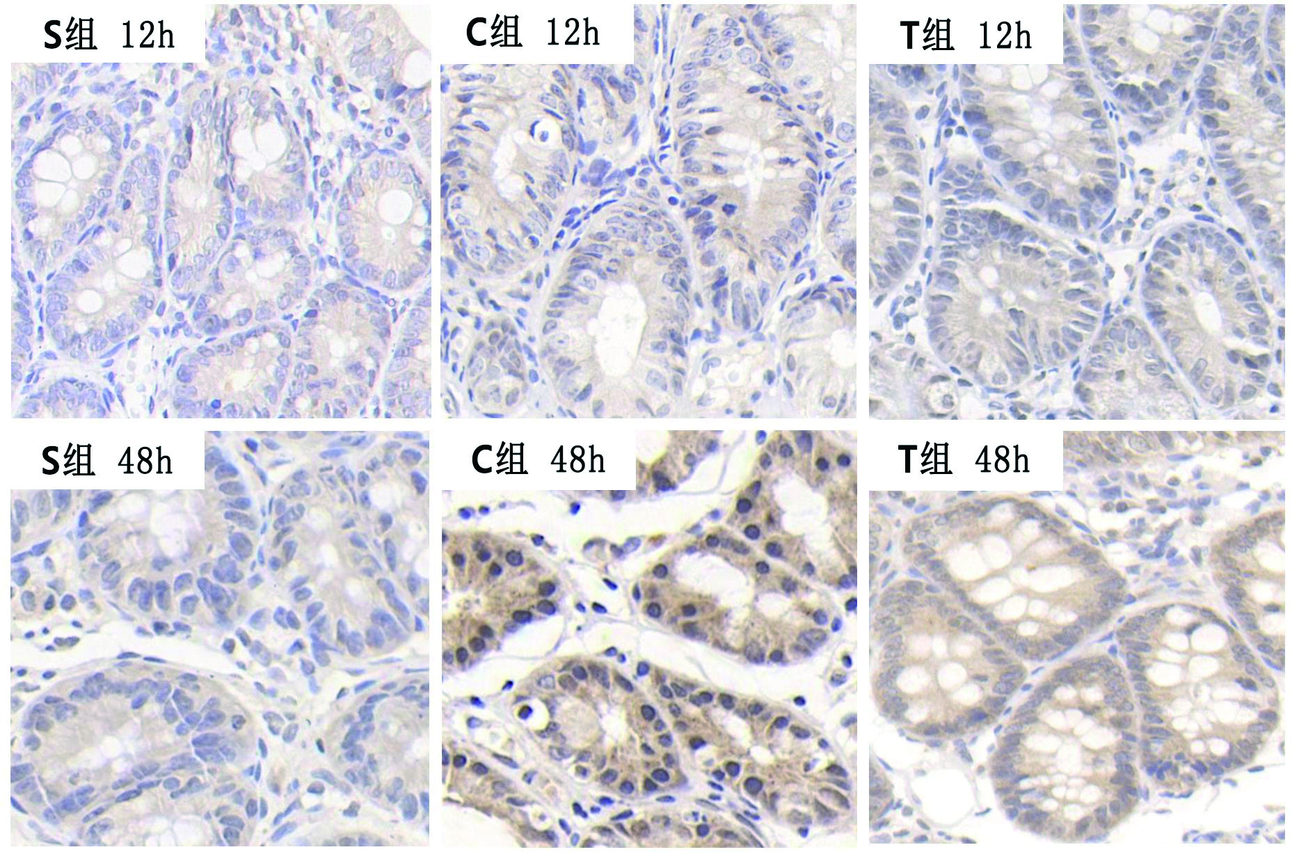 1.2 实验动物分组及构建模型实验动物分组:清洁级雄性SD大鼠120只,体质量200~250 g,购于福州吴氏实验动物中心,许可证:SCXK(闽)2014-0005。按随机数字表法随机分为三组:假手术组(S组),模型组(C组),治疗组(T组)。实验动物购买后饲养一周,水合氯醛麻醉后沿腹正中线切口,C组及T组采用盲肠结扎穿孔术(CLP)建立脓毒症模型,S组暴露盲肠,不行CLP,余操作同上。术后1 h T组腹腔注射抗IL-6单克隆抗体40 mg/kg,S组和C组腹腔注射等量乳酸钠林格液。分别在术后3 h、12 h、24 h、48 h从三组各取10只大鼠抽取心脏血5 mL,肝素抗凝,离心后置于-70 ℃冰箱备用。钝性分离小肠黏膜组织(距回盲部10 cm回肠),分块切割后用10%甲醛溶液固定,脱水包埋处理后制作石蜡切片,其余肠黏膜液氮冷冻,-70 ℃保存。