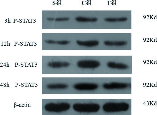 S组小肠黏膜p-STAT3在各时间点的蛋白表达均无明显差别,C组和T组在12 h、24 h、48 h的p-STAT3蛋白表达均高于S组,随时间延长C组p-STAT3的表达逐渐升高,T组各时间点表达趋势同C组,但表达水平相对较低,见表 4、图 3。