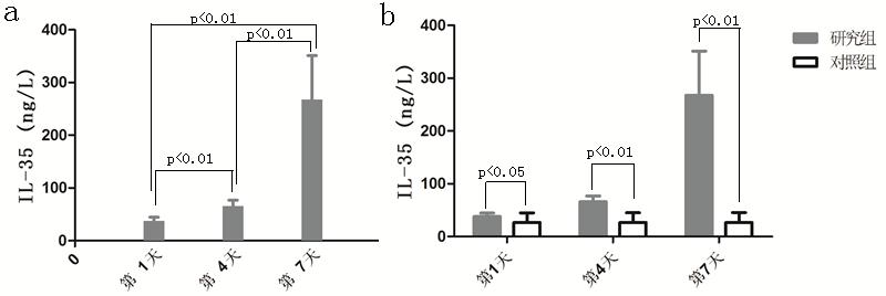 图 1 A研究组各个时间点上的血清IL-35水平的比较;B研究组与对照组在三个不同时间点上的血清IL-35水平比较 Fig 1 (A).IL-35 levels at various time in the study group; (B). IL-35 levels at three different time in the study groups and the controls