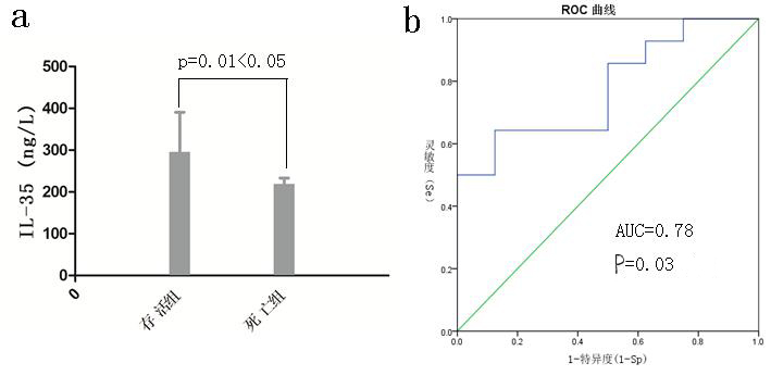 图 3 A:研究病例中存活组与死亡组的血清IL-35水平比较;B:存活组和死亡组血清IL-35水平的ROC曲线图 Fig 3 A:Difference of IL-35 levels between the survival group and the death; B:ROC curves of IL-35 levels in this two groups