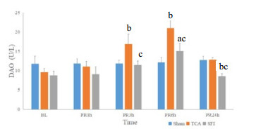 与Sham组相比,TCA组的IFABP与DAO水平在复苏后3、6 h明显增高(均P < 0.05),SFI组的IFABP水平在复苏后3 h、DAO水平在复苏后6 h明显增高(P < 0.05),在复苏后24 h明显降低(P < 0.05);与TCA组相比,SFI组的IFABP与DAO水平在复苏后3、6与24 h均明显降低(均P < 0.05)。(图 1图 2