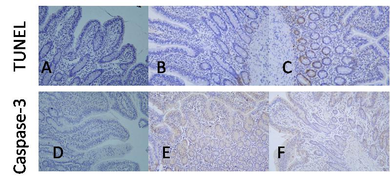 图 3 光镜下三组肠组织细胞凋亡情况(TUNEL×200)和Caspase-3表达(SP×200)