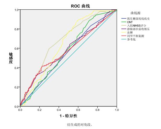 多因素分析结果显示入院时NIHSS评分与静脉溶栓预后极显著相关;既往糖尿病病史,发病-治疗时间、静脉溶栓前收缩压、血糖、同型半胱氨酸与静脉溶栓预后显著相关;ROC曲线及曲线下面积结果显示敏感程度由高至低依次为:入院时NIHSS评分、血糖、静脉溶栓前收缩压、同型半胱氨酸、发病-治疗时间及既往糖尿病病史。