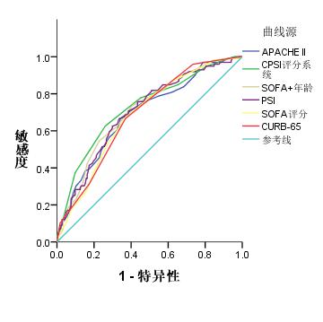 ROC曲线下面积显示,APACHEⅡ评分、SOFA评分、SOFA+年龄评分、CURB-65评分、PSI评分及CSPI评分均能预测CAP预后(均P < 0.05),其中CSPI评分效能最强,AUC为0.725。