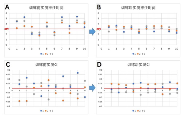 操作者经过3 s定时推注训练后,10名操作者推注速度的稳定性较训练前明显增强(P=0.008),个体间的差异亦明显缩小(训练前,推注速度的标准差为1.02,训练为0.26)(见图 3AB);训练后10例患者PiCOO测定中的CI值的偏离度亦较训练前明显缩小(P=0.012)(见图 3CD)。